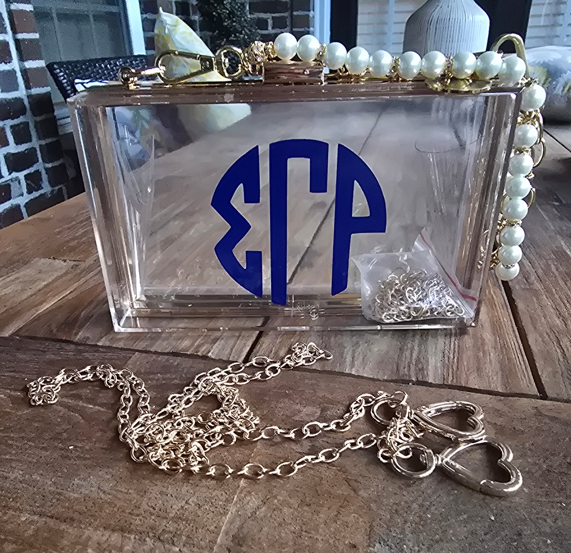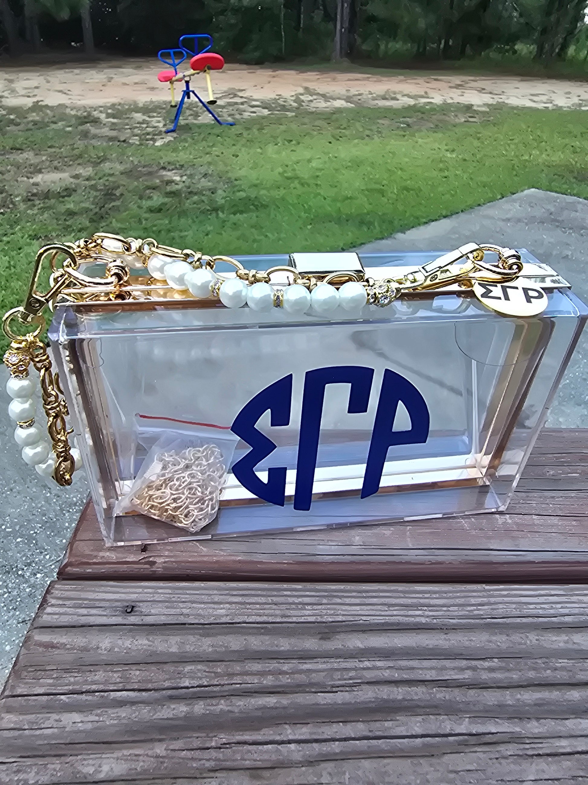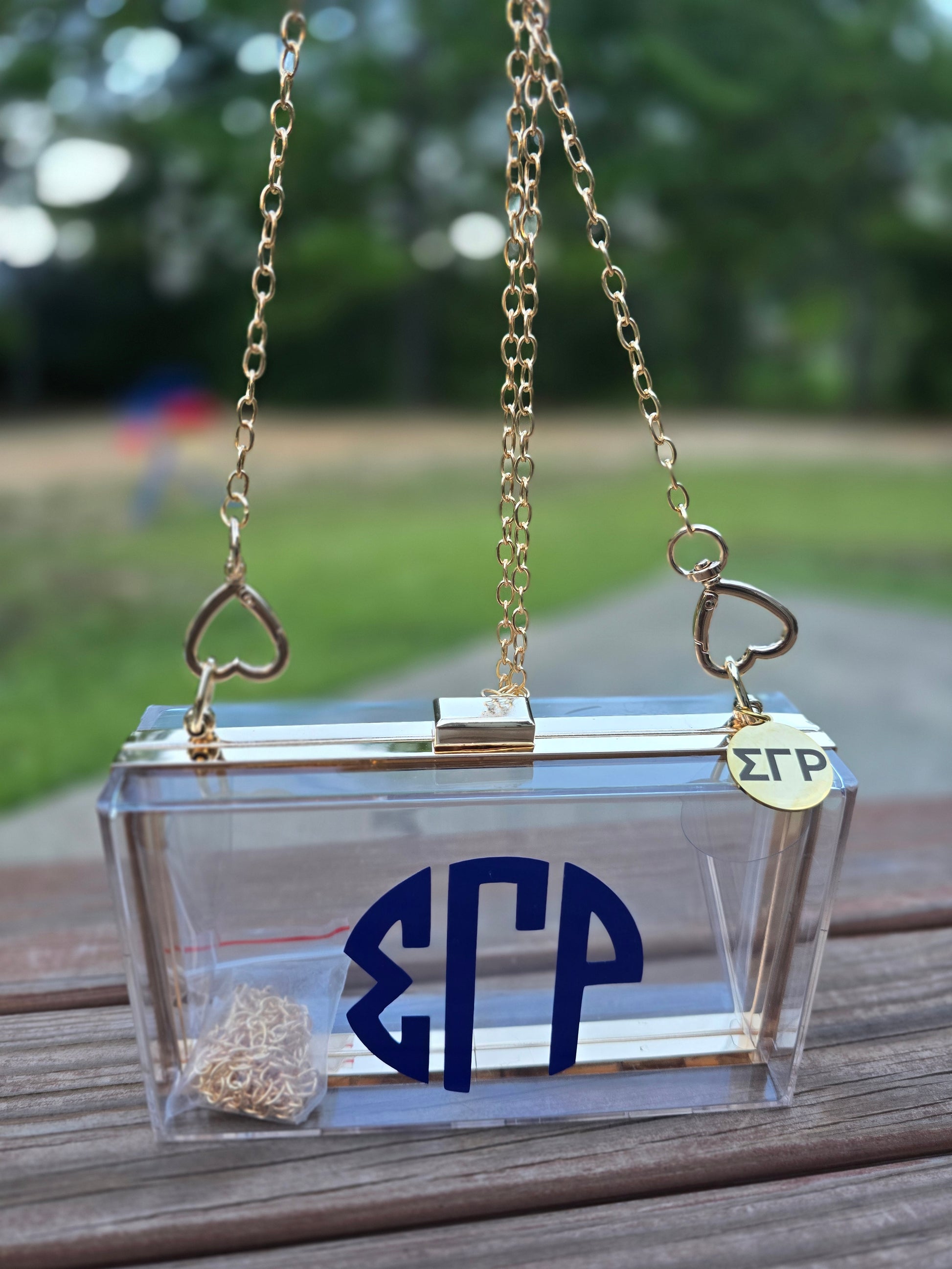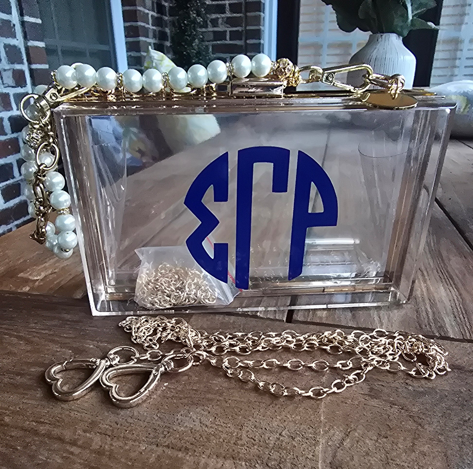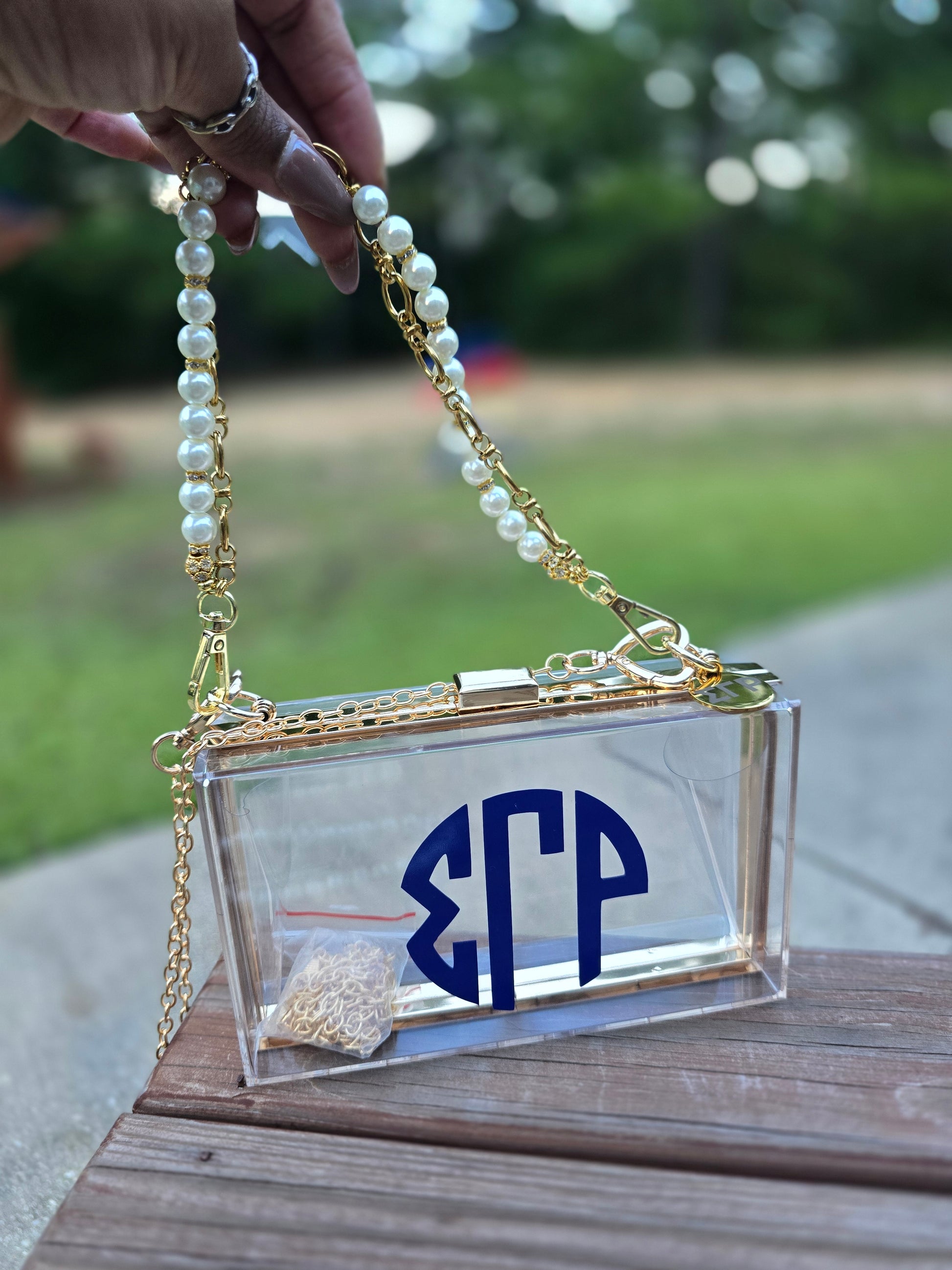 SGRho Clear Acrylic Crossbody/Clutch Handbag with sorority charm as the perfect detailed touch for the custom bag.
