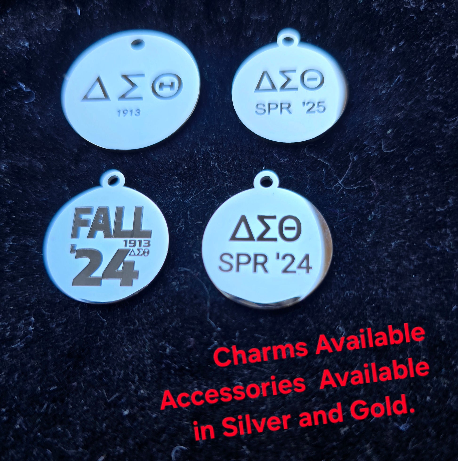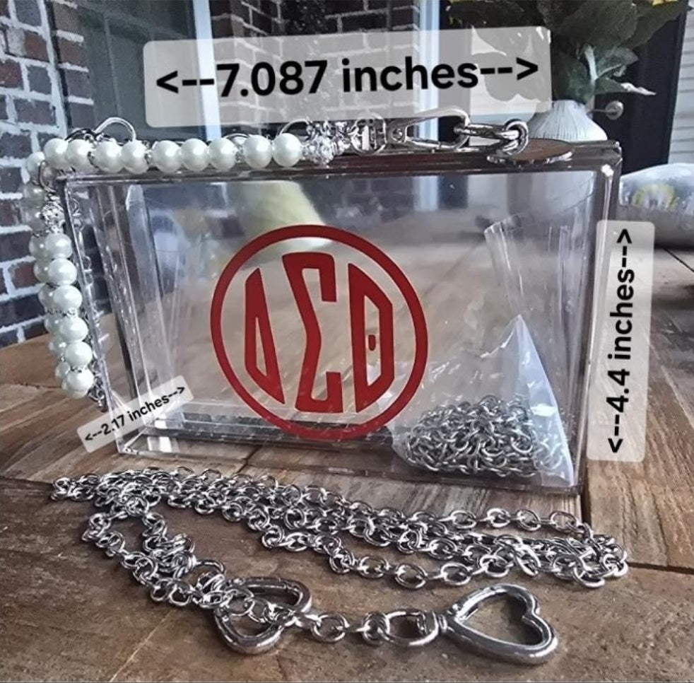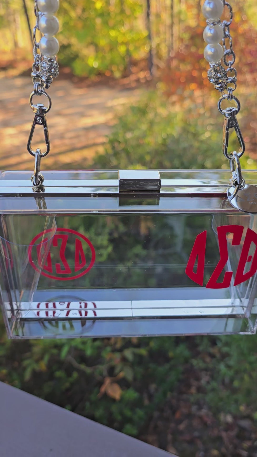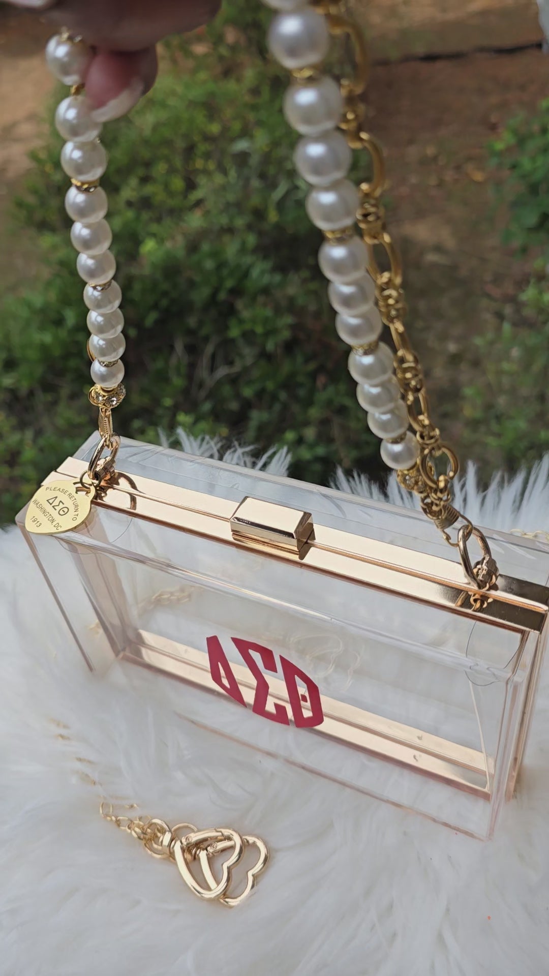 ΔΣΘ Clear Acrylic Crossbody/Clutch Handbag with sorority charm as the perfect detailed touch for the custom bag.